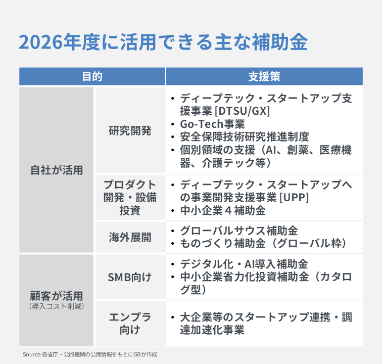 2026年度の国の補助金のうち、特にスタートアップからのニーズが高い11件を紹介します。スタートアップが事業者単位で活用できる規制改革制度についてもまとめました。