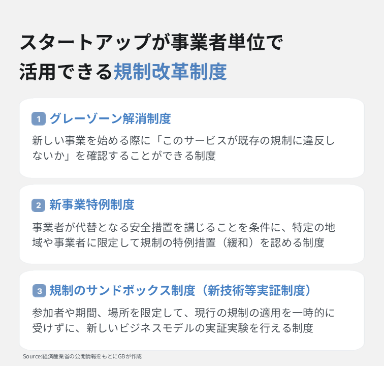 参加者や期間、場所を限定することで、現行の規制の適用を一時的に受けずに、AIやIoT、モビリティなどの新しいビジネスモデルの実証実験を行える枠組みです。 現在、スタートアップに最も利用されている制度として知られています。